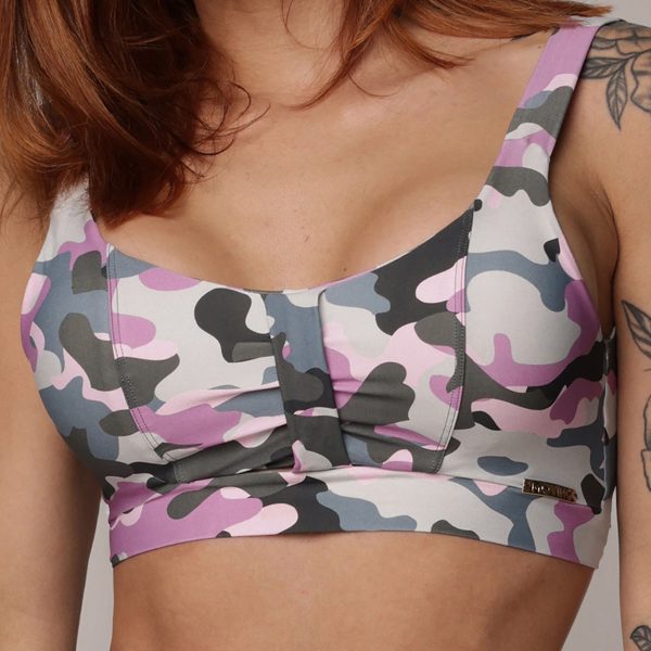 O rosa, símbolo de confiança e força, traz um contraste surpreendente à estampa camuflada, enquanto os tons neutros garantem versatilidade e equilíbrio.
