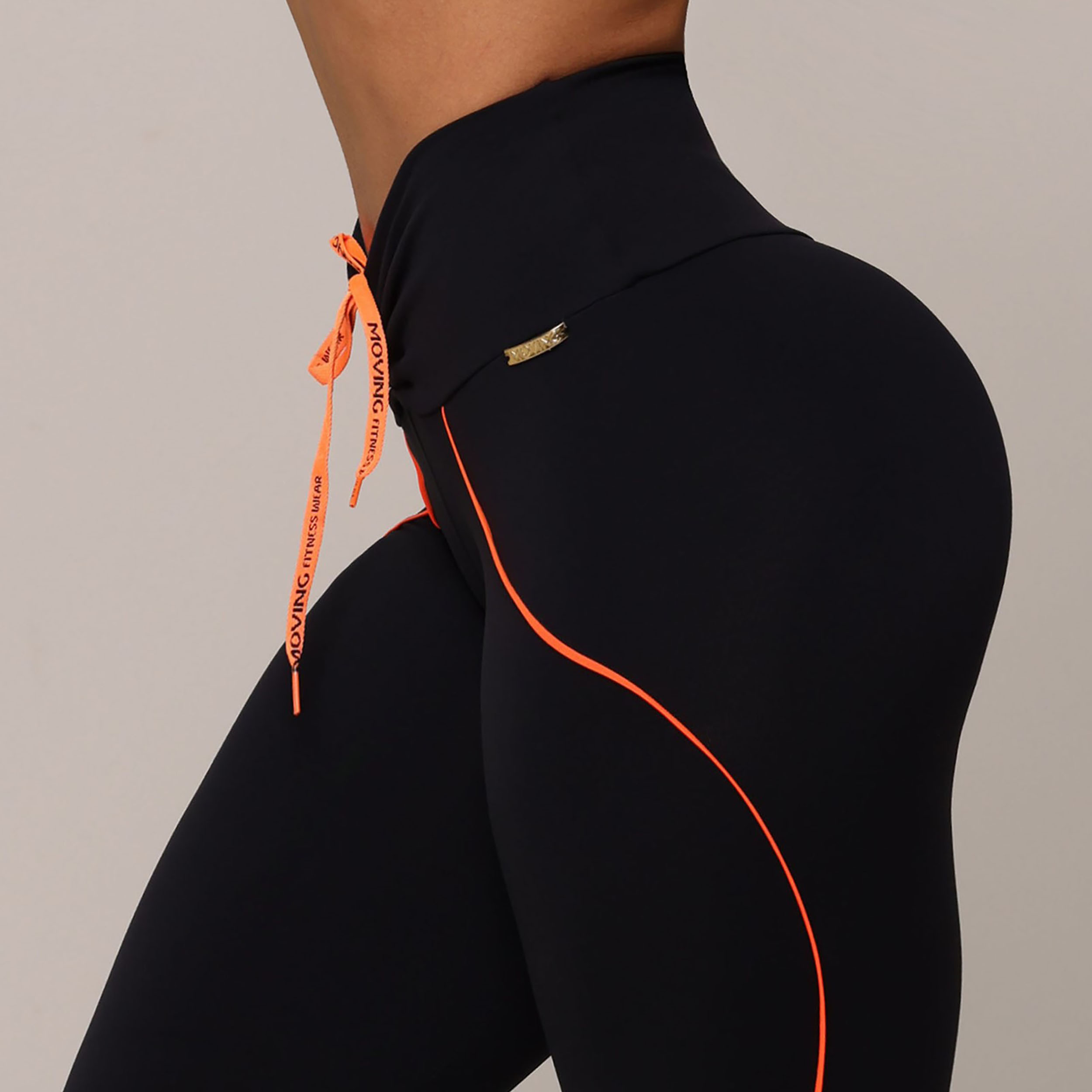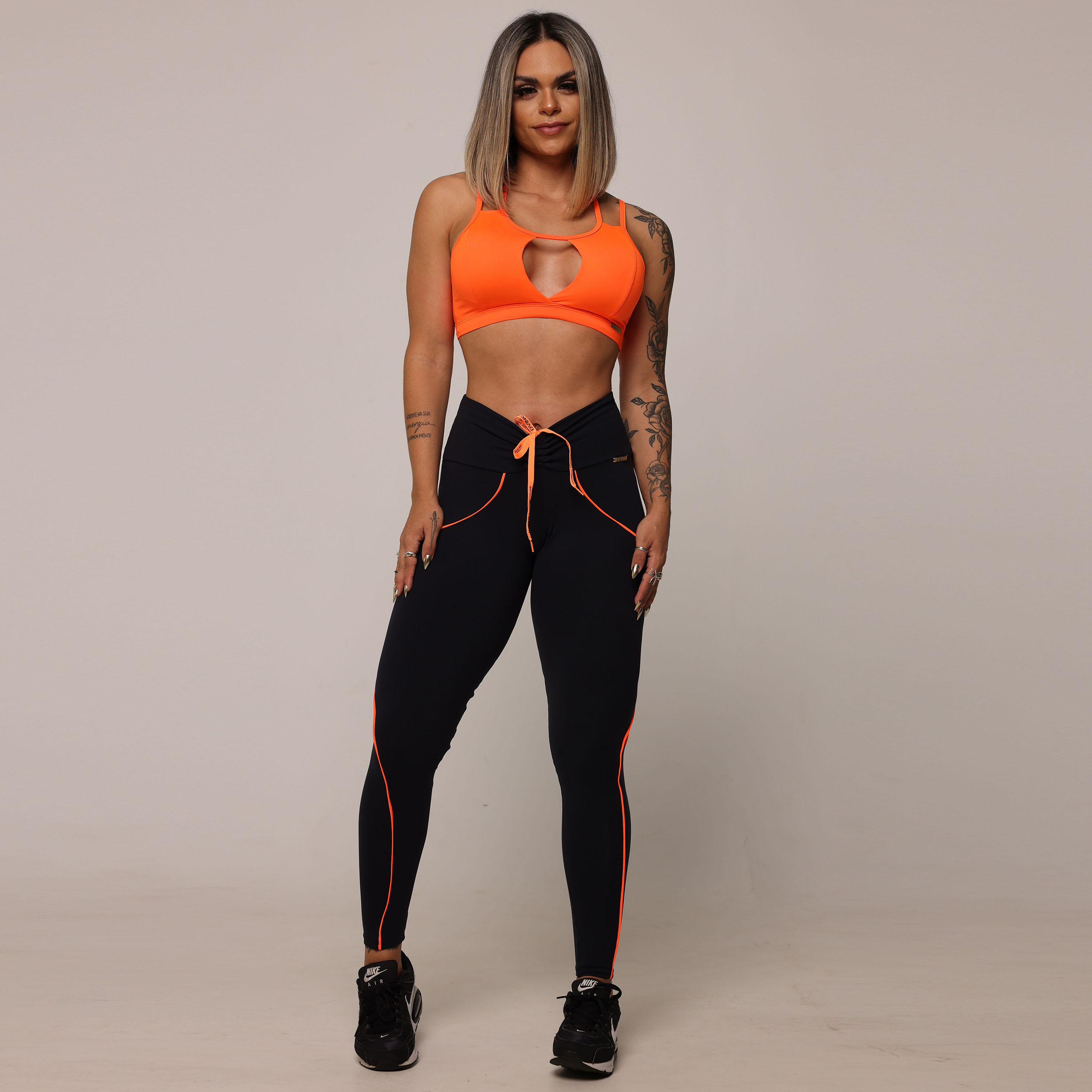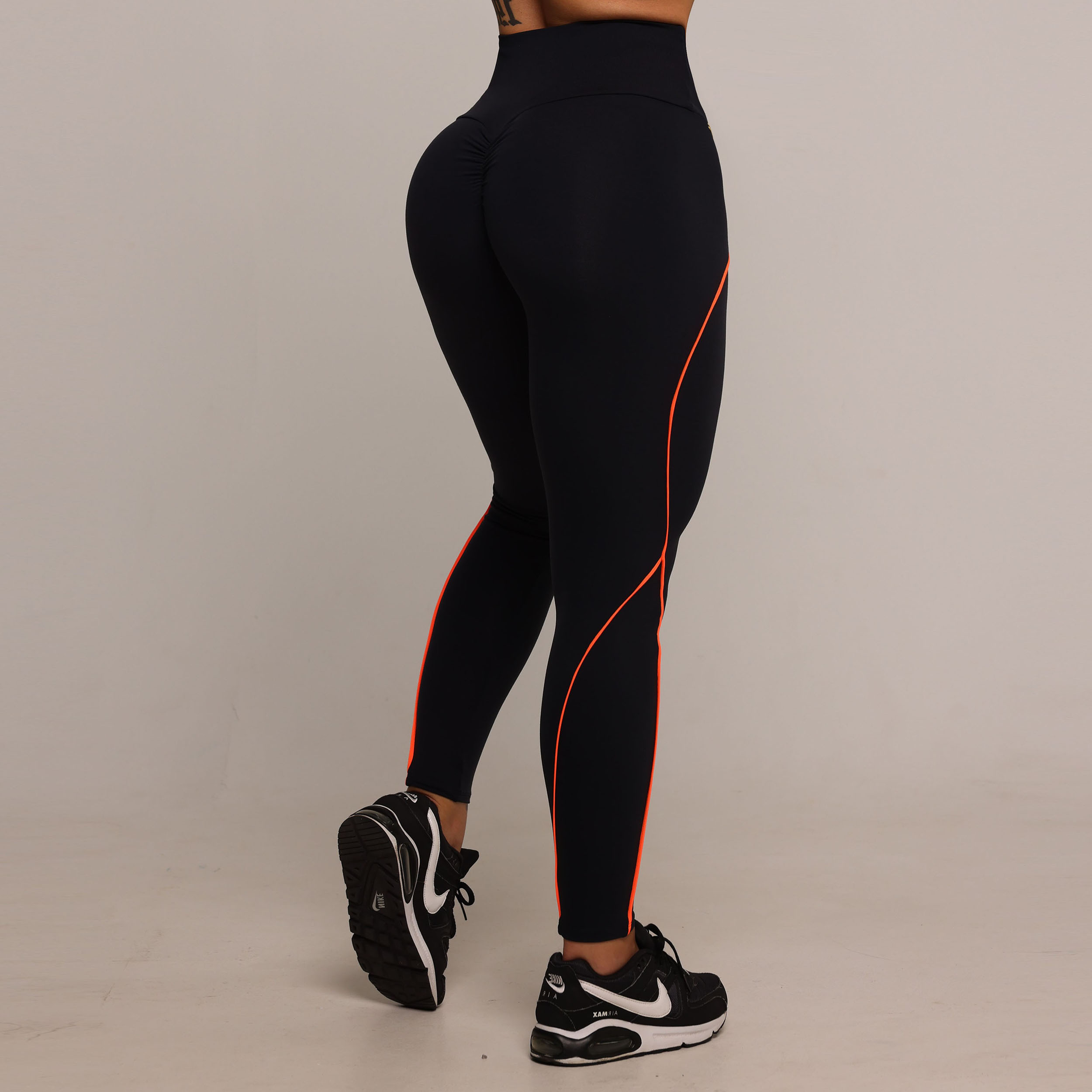 LEGGING LINEAR EMPINA BUMBUM PRETA COM CADARÇO LARANJA NEON