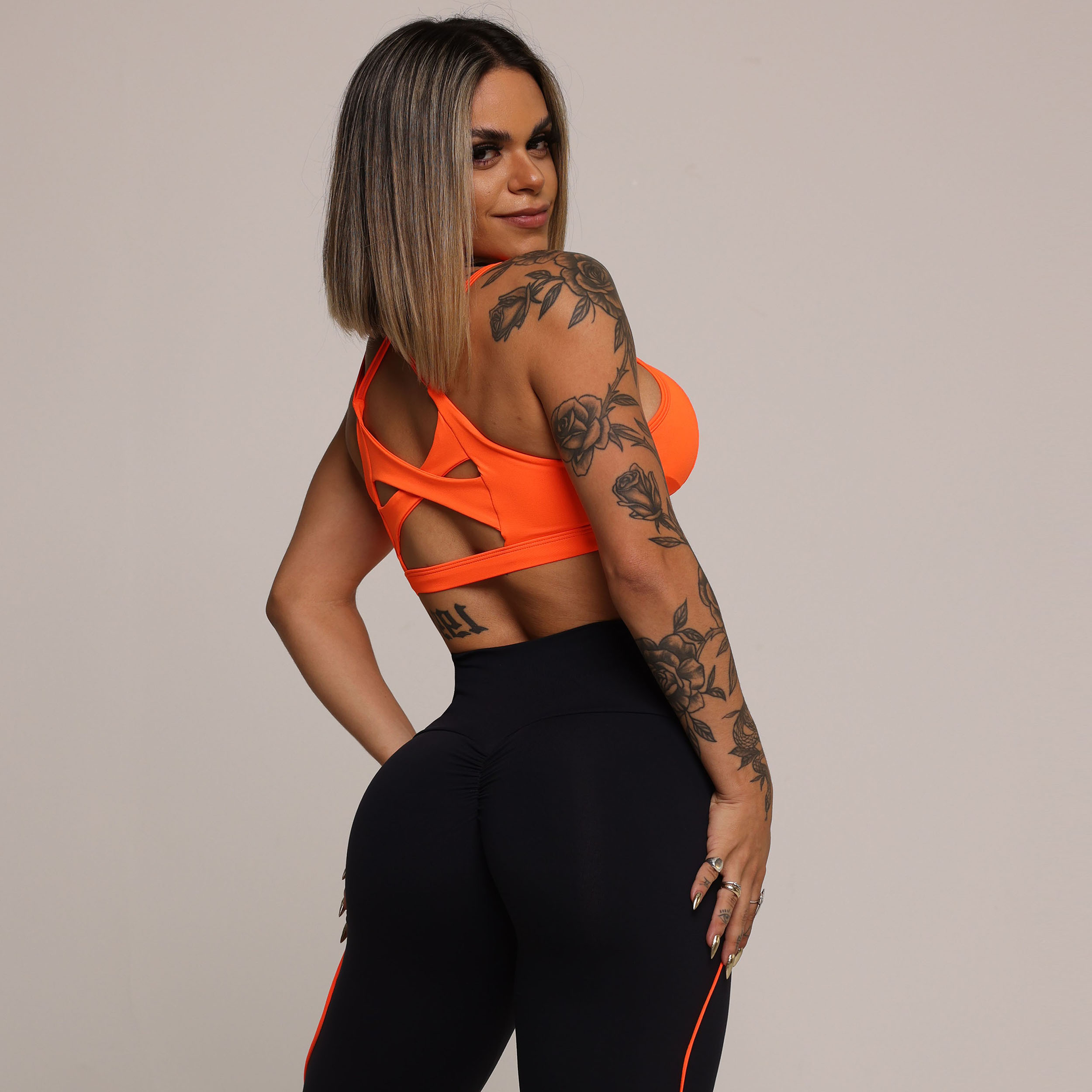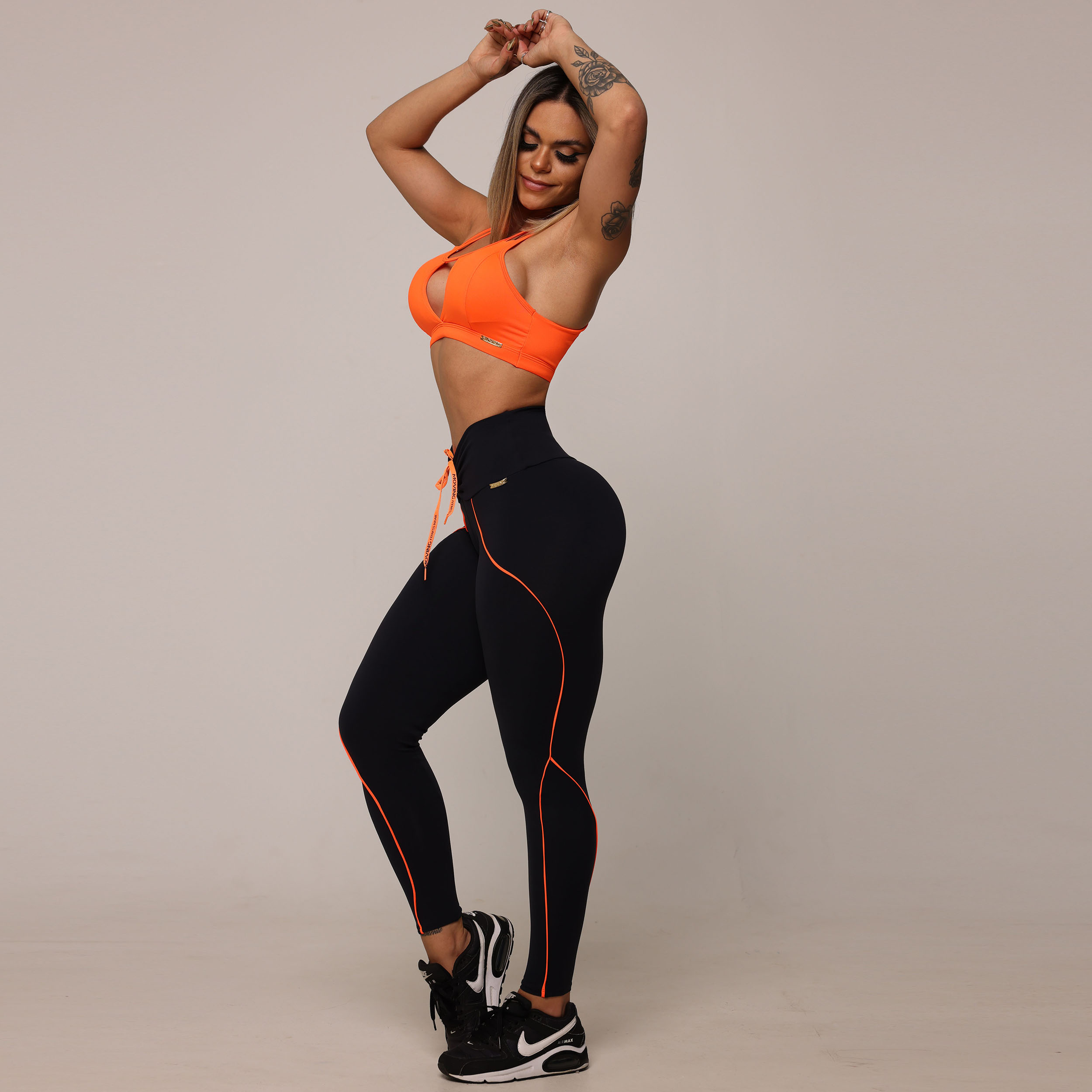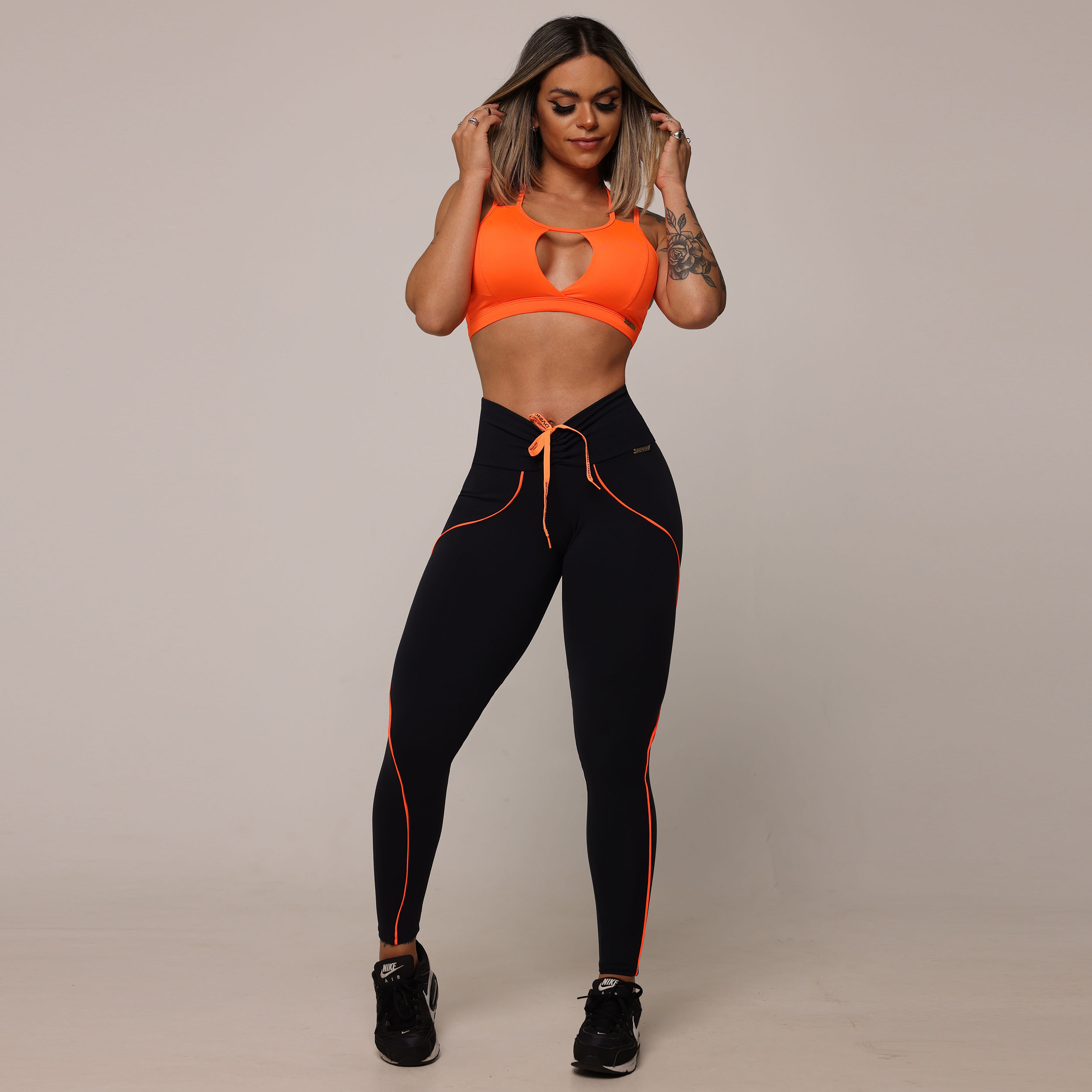 LEGGING LINEAR EMPINA BUMBUM PRETA COM CADARÇO LARANJA NEON