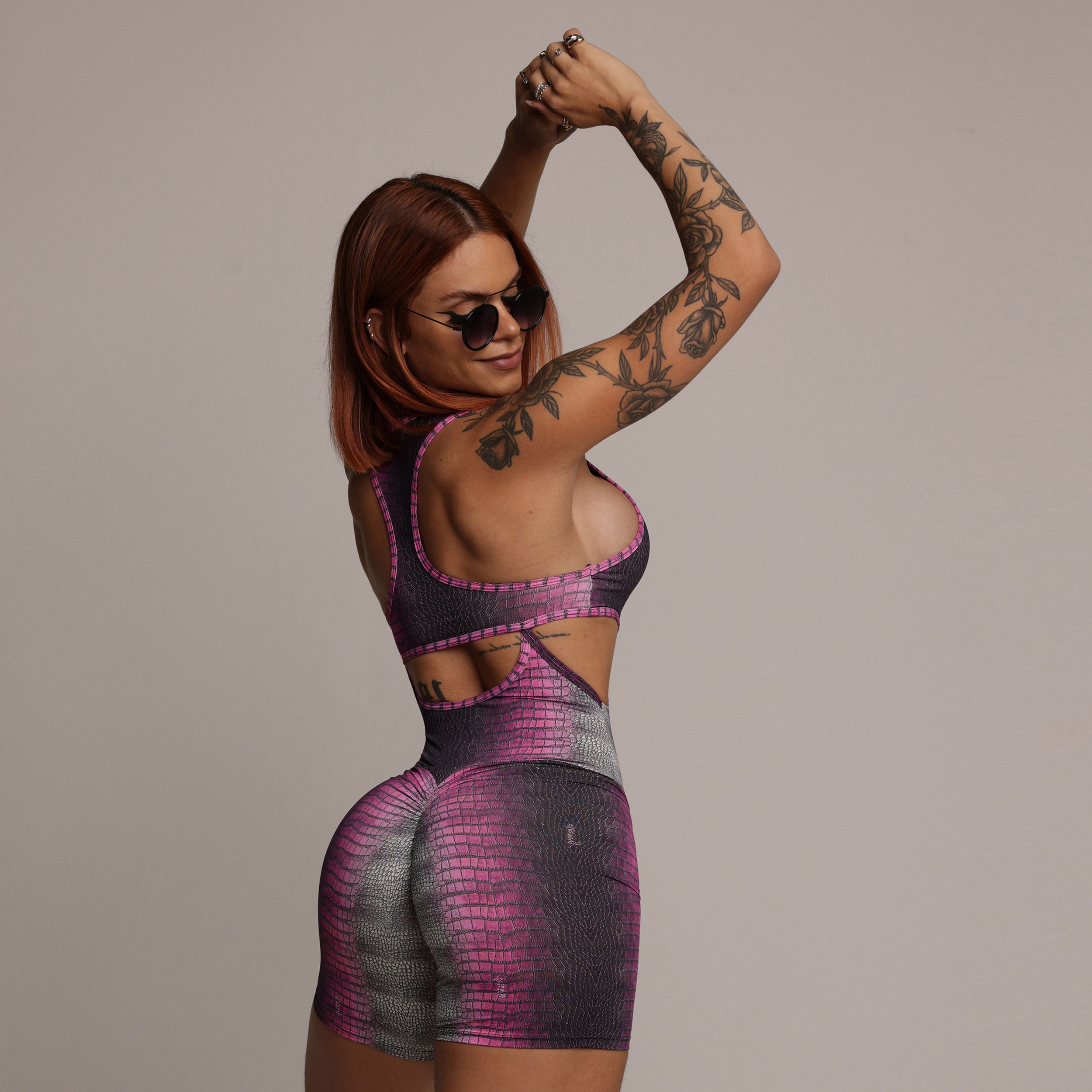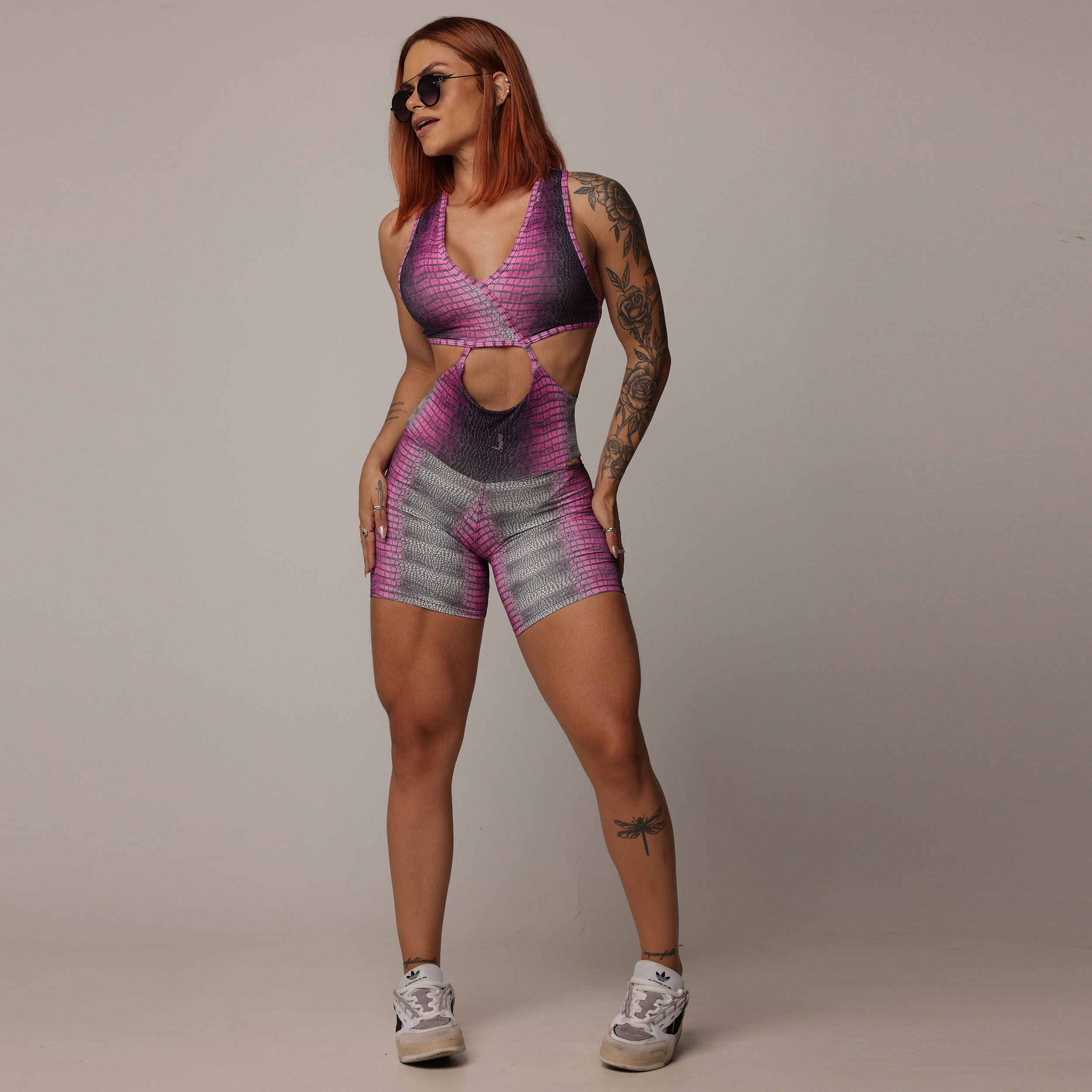 Inspirada na elegância da pele de cobra, conta com detalhes de sofisticação em rosa e preto.