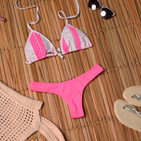 BIQUÍNI CORTININHA LISTRADO ROSA NEON COM CALCINHA ROSA