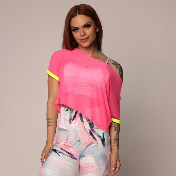 CROPPED OMBRO A OMBRO DE TULE ROSA NEON