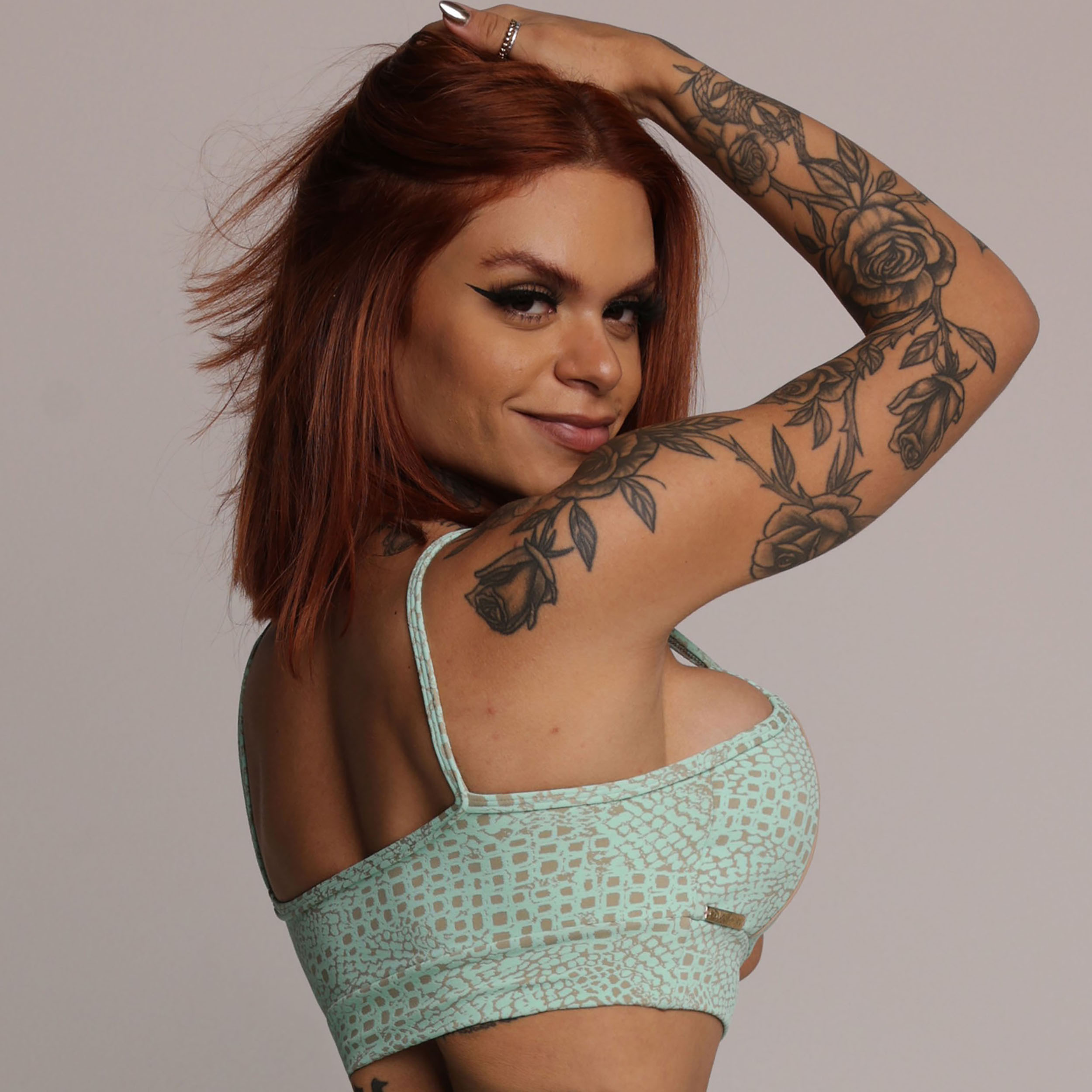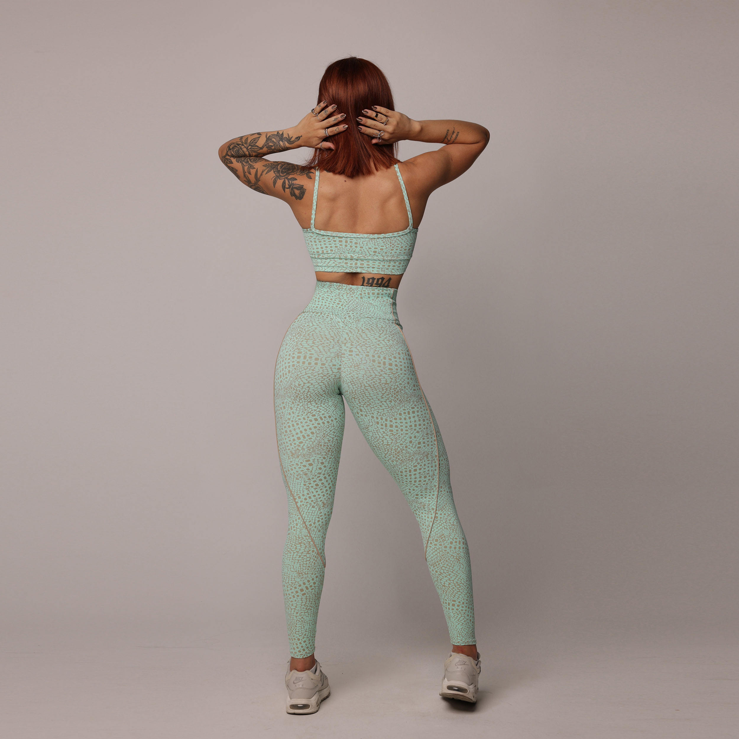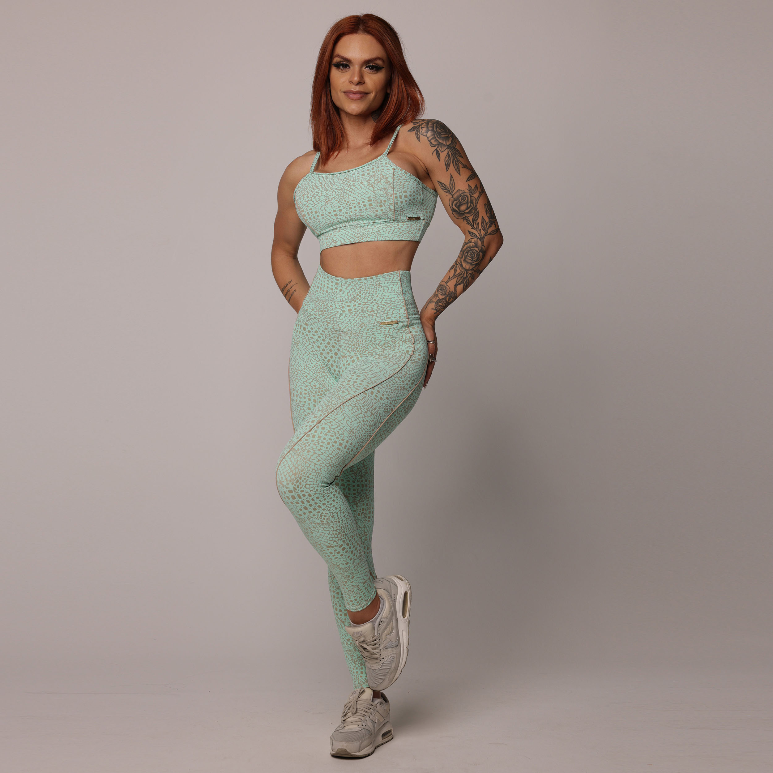 O mesmo tecido texturizado da coleção Jacquard Snake Nude agora em verde menta, adicionando um toque de cor e refrescância ao seu estilo.