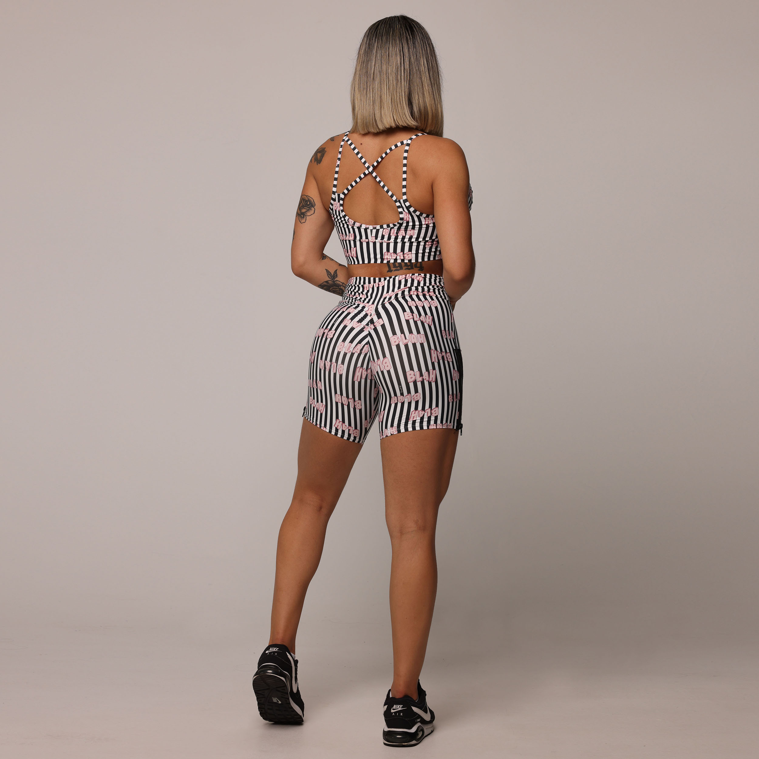 Lines Bla Bla Bla une as atemporais listras preta, branca e rosa aos dizeres que ecoam o bate-papo animado da mulherada.